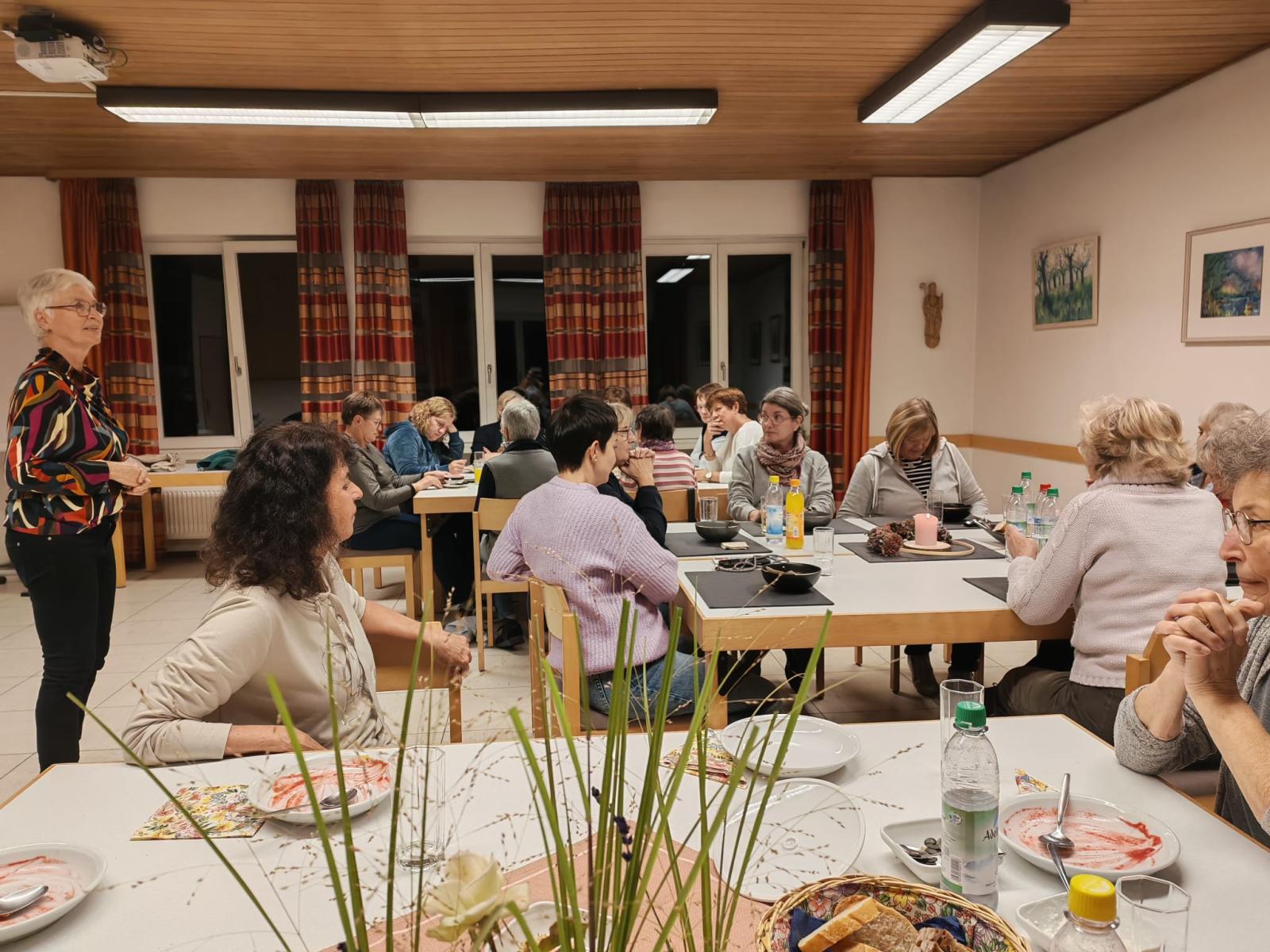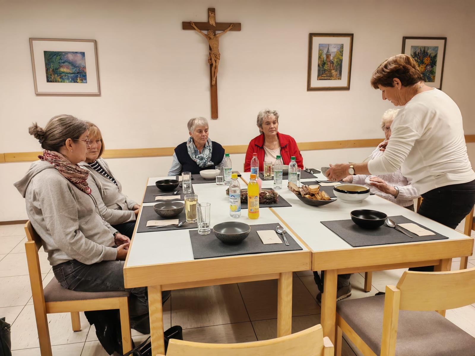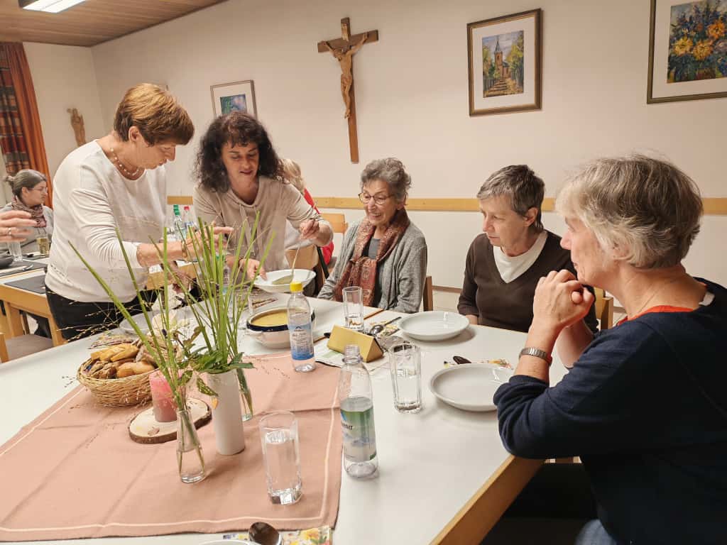 Während die Frauen an unterschiedlich, traditionell bis modern gedeckten Tischen Platz nahmen und bei der bewährten Kartoffelsuppe, der schmackhaften Kürbissuppe, der bisher unbekannten Selleriesuppe und der kräftigen Rote-Beete-Suppe die teils untypischen Zutaten erschmeckten, zeigten ihnen Irmtraud Ewender und Maria Wittmann nach und nach überraschende Parallelen zum Frauenbund auf: in den Suppen und beim KDFB haben Neues und Bewährtes Platz, die richtige Mischung aus unterschiedlichsten Zutaten ergibt ein stimmiges Ganzes.